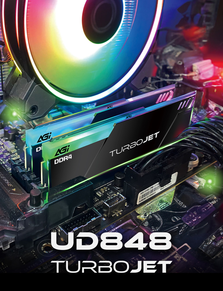 The AGI TurboJet UD848 RGB is a high-performance DDR4 memory kit designed for gamers and PC enthusiasts who want a blend of speed and vibrant aesthetics. Part of AGI’s “TurboJet” series, it features a sleek black aluminum heat spreader and customizable RGB lighting to enhance any modern desktop build.
