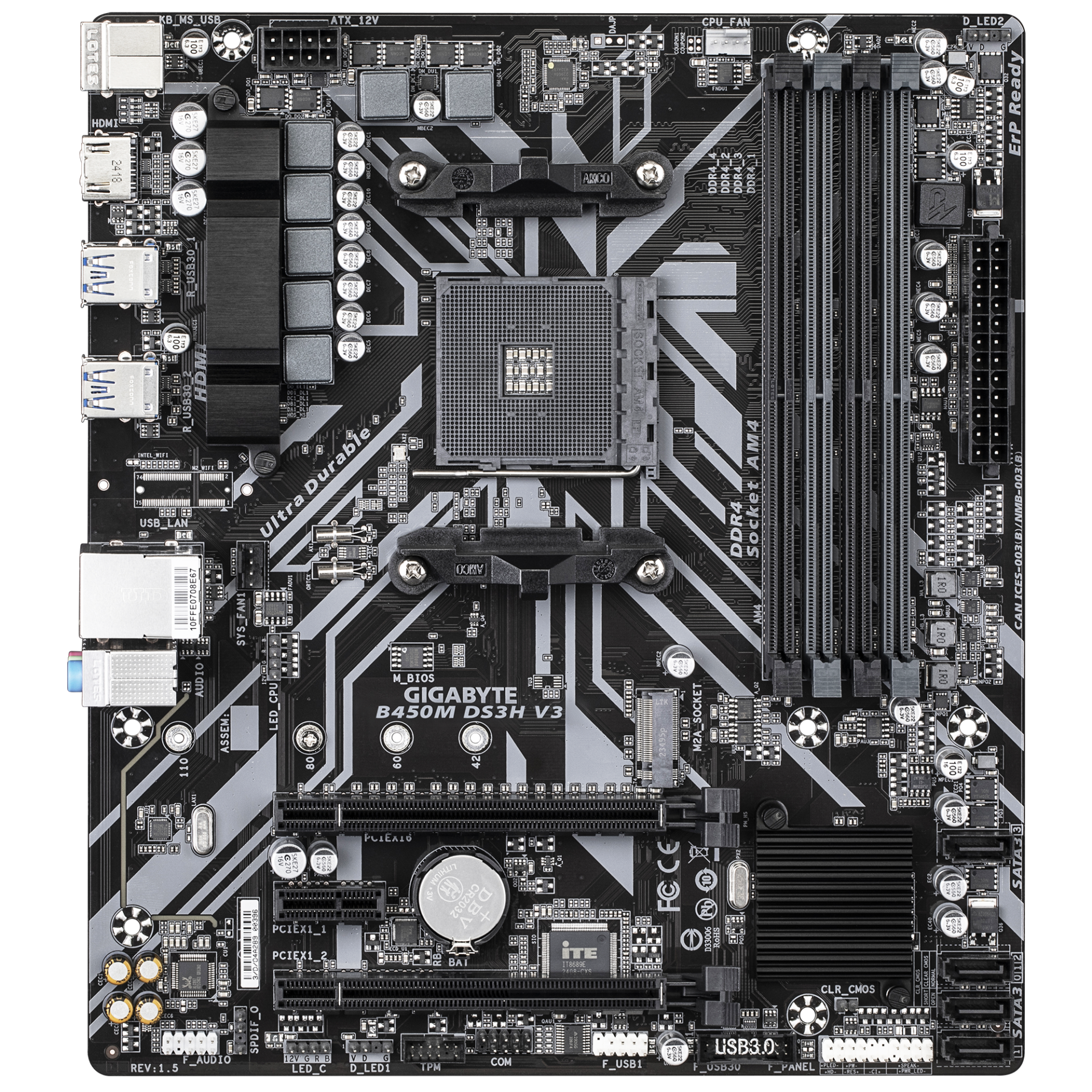 The Gigabyte B450M DS3H V3 is a micro-ATX motherboard designed for AMD Ryzen processors, offering a cost-effective solution for versatile PC builds. It supports DDR4 memory with dual-channel architecture and features one M.2 slot for fast NVMe SSDs, enhancing storage performance. The board includes PCIe 3.0 slots for expansion cards and multiple USB 3.1 ports for connectivity. Its HDMI and DVI-D ports provide options for integrated graphics output. The motherboard also features Gigabyte’s Ultra Durable components for enhanced longevity and reliability. With a straightforward design, it’s suitable for both entry-level and mainstream users seeking a stable and efficient system foundation.